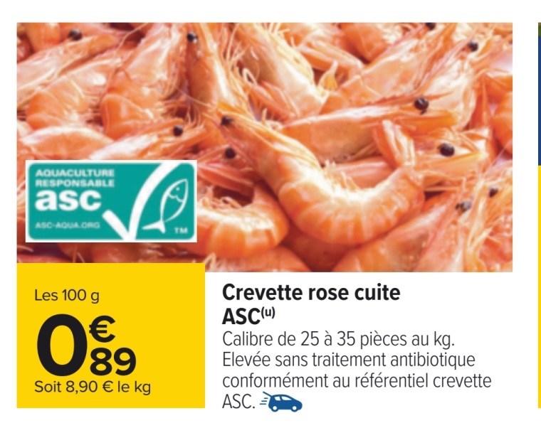 CREVETTE ROSE CUITE SANS ANTIBIOTIQUE (CAL=25/35)(LABEL=ASC)(MDP=ELEVAGE)(O=EQUATEUR)(VENTE=TRADITIO